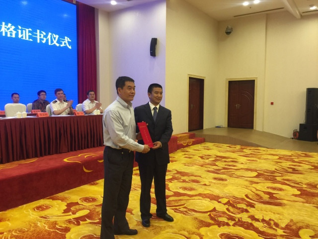 聯(lián)合驗(yàn)收組組長(zhǎng)、海關(guān)總署加貿(mào)司李志輝副司長(zhǎng)向昆明綜合保稅區(qū)管委會(huì)專(zhuān)職副主任張宏頒發(fā)合格證書(shū)