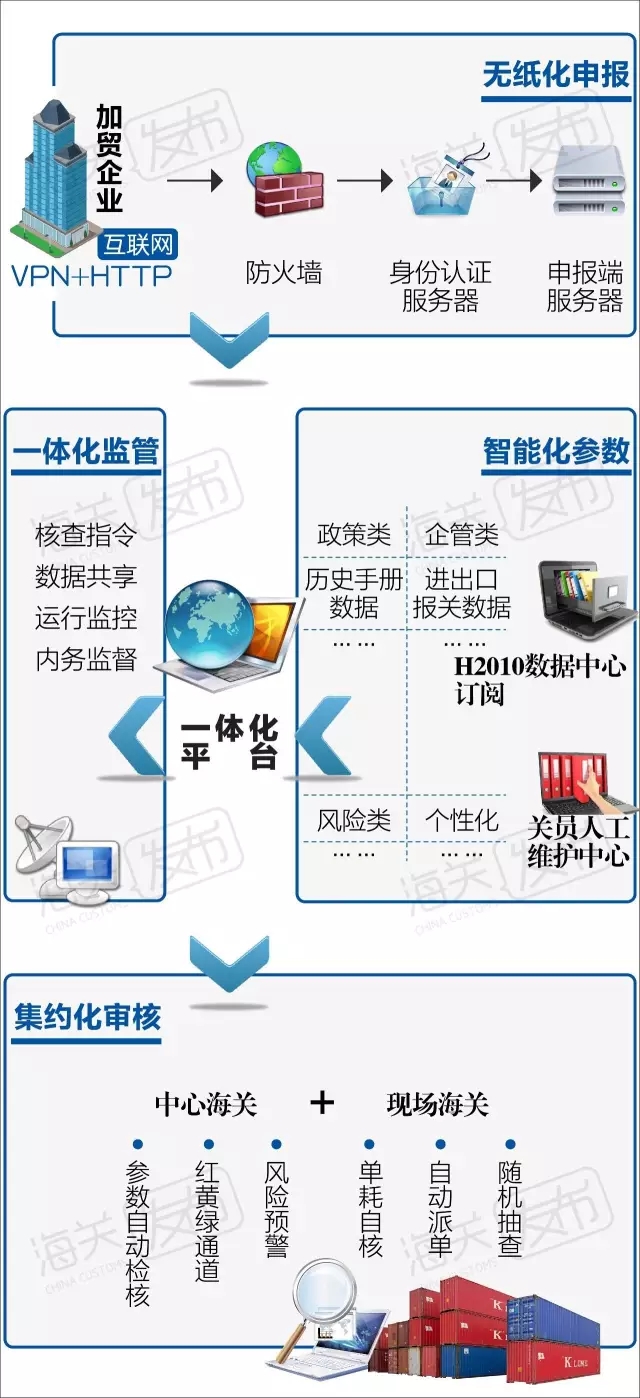 通過內(nèi)部的流程再造,以信息化手段實(shí)現(xiàn)加工貿(mào)易海關(guān)執(zhí)法作業(yè)的無紙化,以集中管理、專業(yè)審核實(shí)現(xiàn)集約化,以完善風(fēng)險(xiǎn)參數(shù)實(shí)現(xiàn)運(yùn)行監(jiān)控的智能化,通過信息互聯(lián)互通,相關(guān)部門廣泛參與、錯(cuò)位監(jiān)管、協(xié)同施力,最終實(shí)現(xiàn)加工貿(mào)易監(jiān)管的一體化。